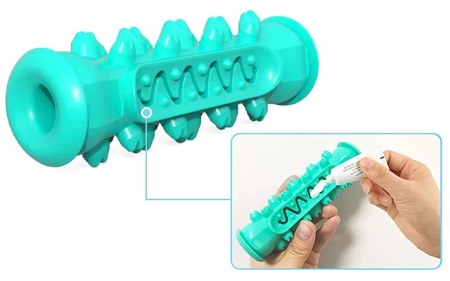 Jucăria noastră de mestecat realizează curățarea dinților animalului. Te va scuti de efortul periajului manual. Poți pune puțină pastă de dinți în interior pentru un efect mai bun.