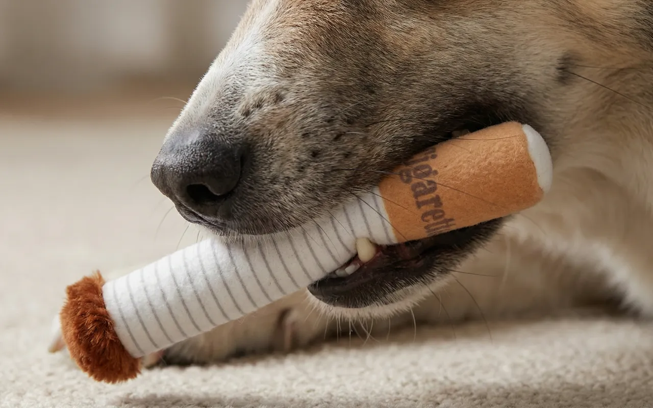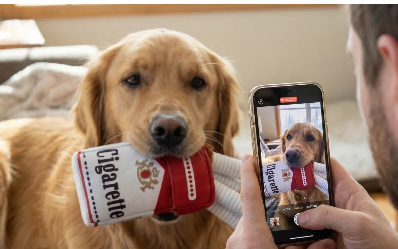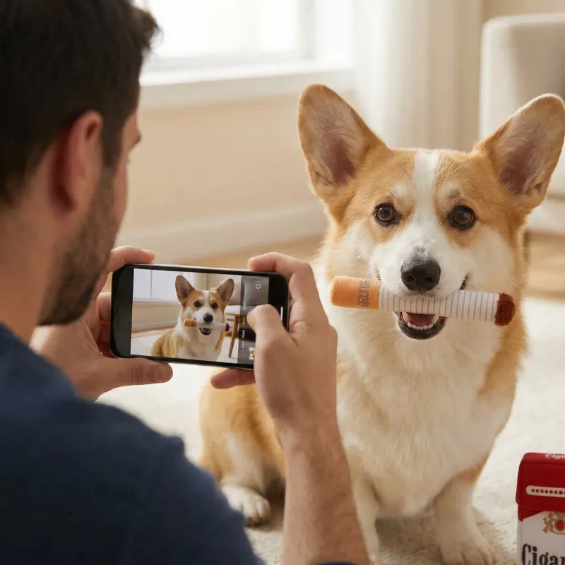 Am cumpărat setul de țigări ca o glumă pentru câinele iubitului meu, iar acum ajungem amândoi pe jos de râs în timp ce câinele își etalează noul „stoc”.