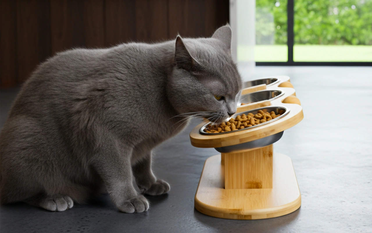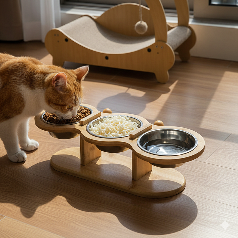 Suportul de lemn face ca hrănirea să arate elegant. L-a ajutat pe motanul nostru mai bătrân să mănânce mai lent și să aibă o digestie mai bună. Bucătăria rămâne mai curată acum.