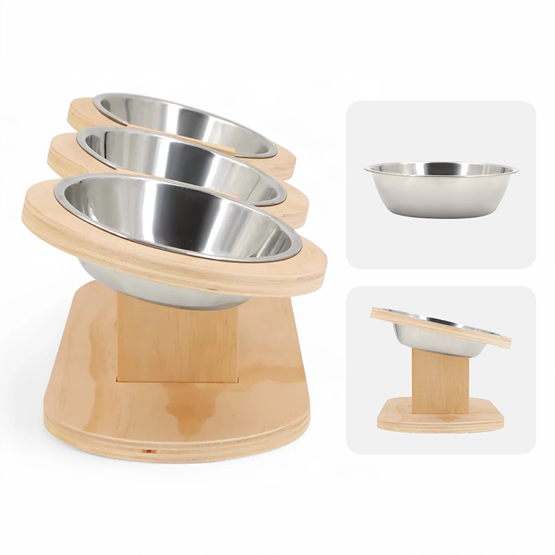 Set 3 boluri înclinate din oțel inoxidabil pentru pisici cu suport din lemn