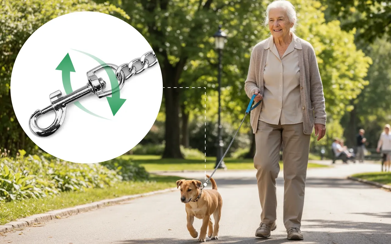 Mișcă-te liber fără noduri sau fire răsucite vreodată. Cârligul ingenios se rotește pentru ca animăluțul tău să stea în siguranță lângă tine.