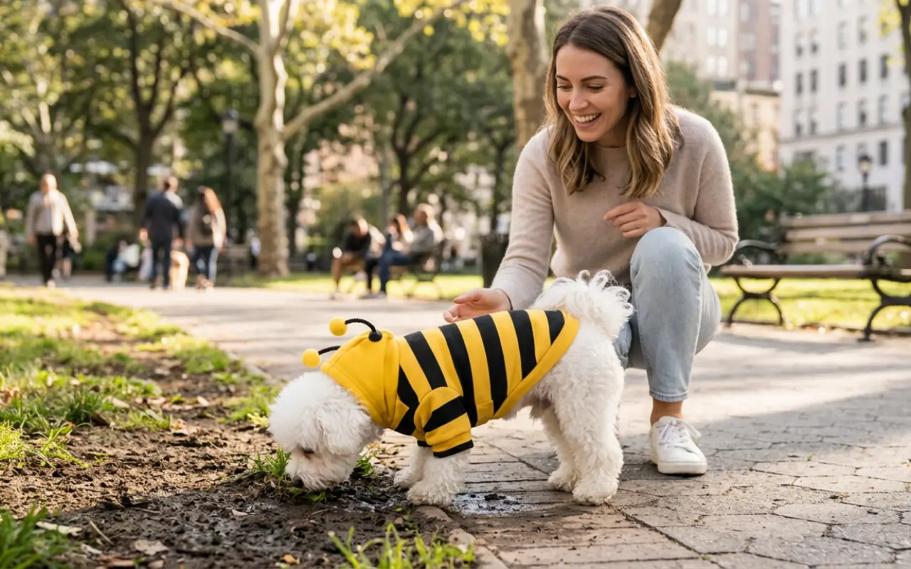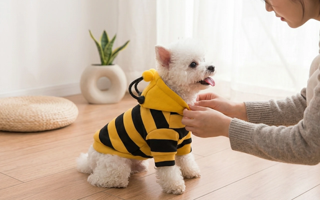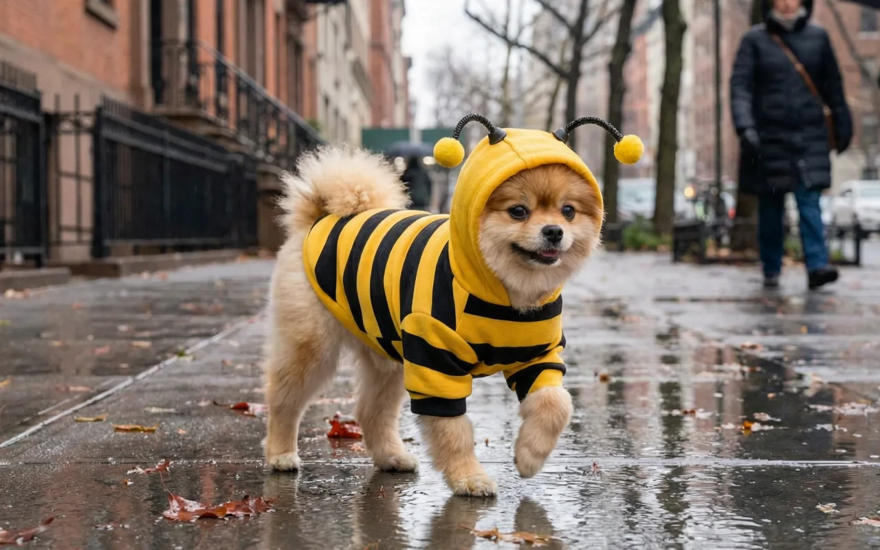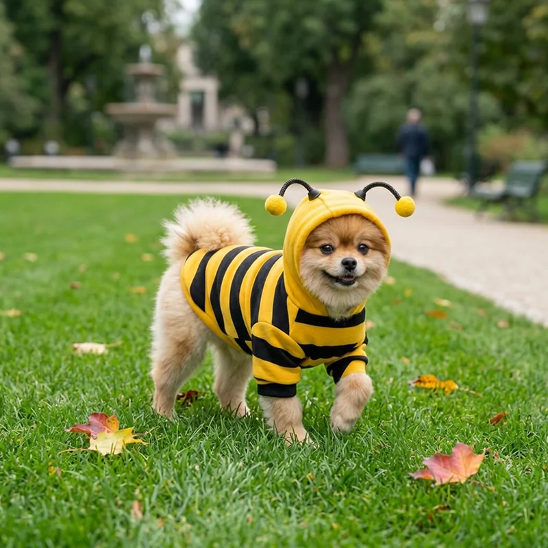 Am luat hanoracul de albină pentru plimbările de toamnă. Câinele meu nu mai tremură, iar copiii din cartier mereu arată cu degetul și chicotesc când îl văd zbârnâind pe stradă.