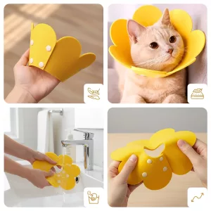 Forma de floare colorată face ca pisicile să arate adorabil și elegant. Stăpânii se bucură să-și vadă animalele de companie vesele chiar și pe perioada vindecării.