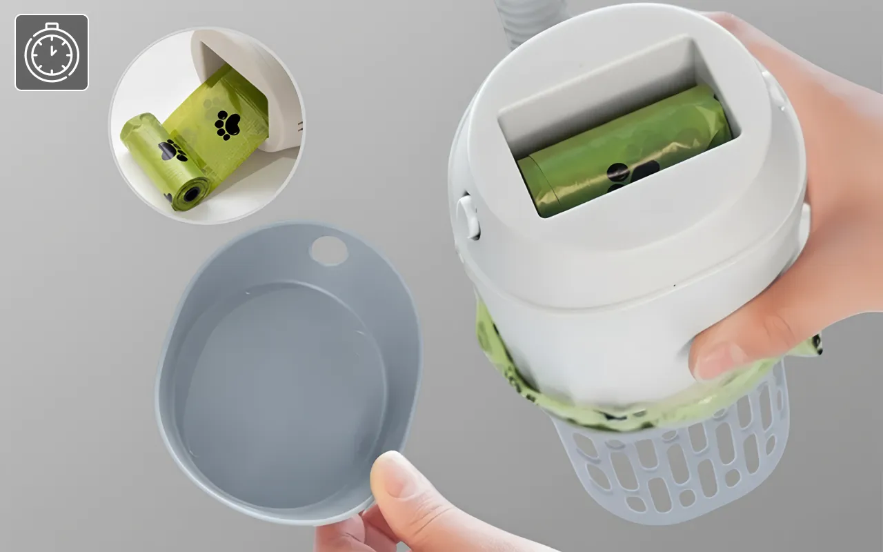 Uită de minutele pierdute căutând pungi sau unelte suplimentare. Totul este pregătit într-un singur loc, astfel încât rutina ta să fie mereu fără probleme.