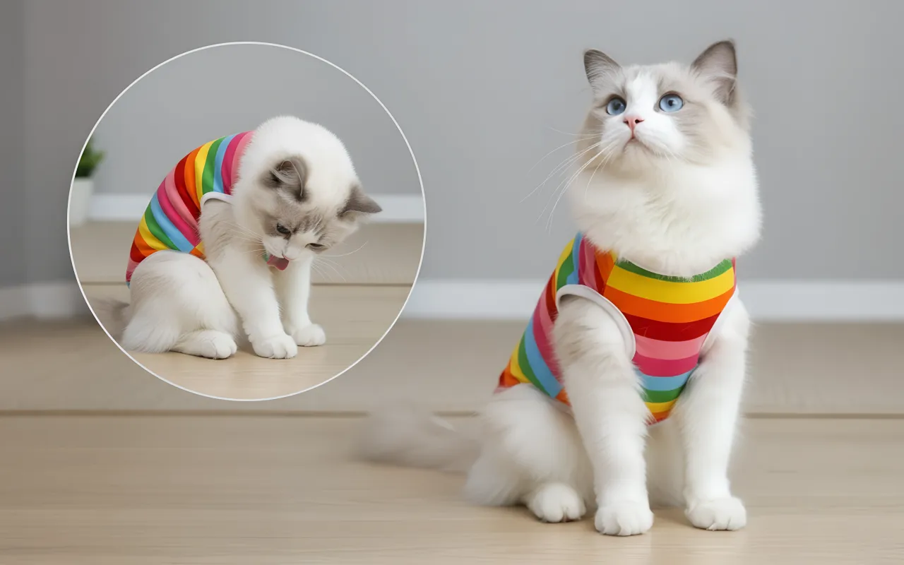 Costumul nostru de recuperare pentru pisici are imprimeuri jucăușe și culori vesele. Transformă vindecarea într-o experiență stilată și plină de voie bună.