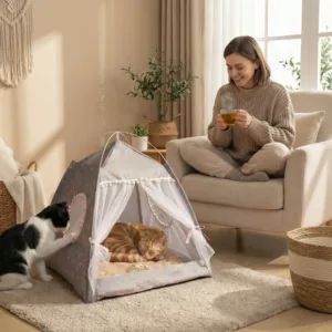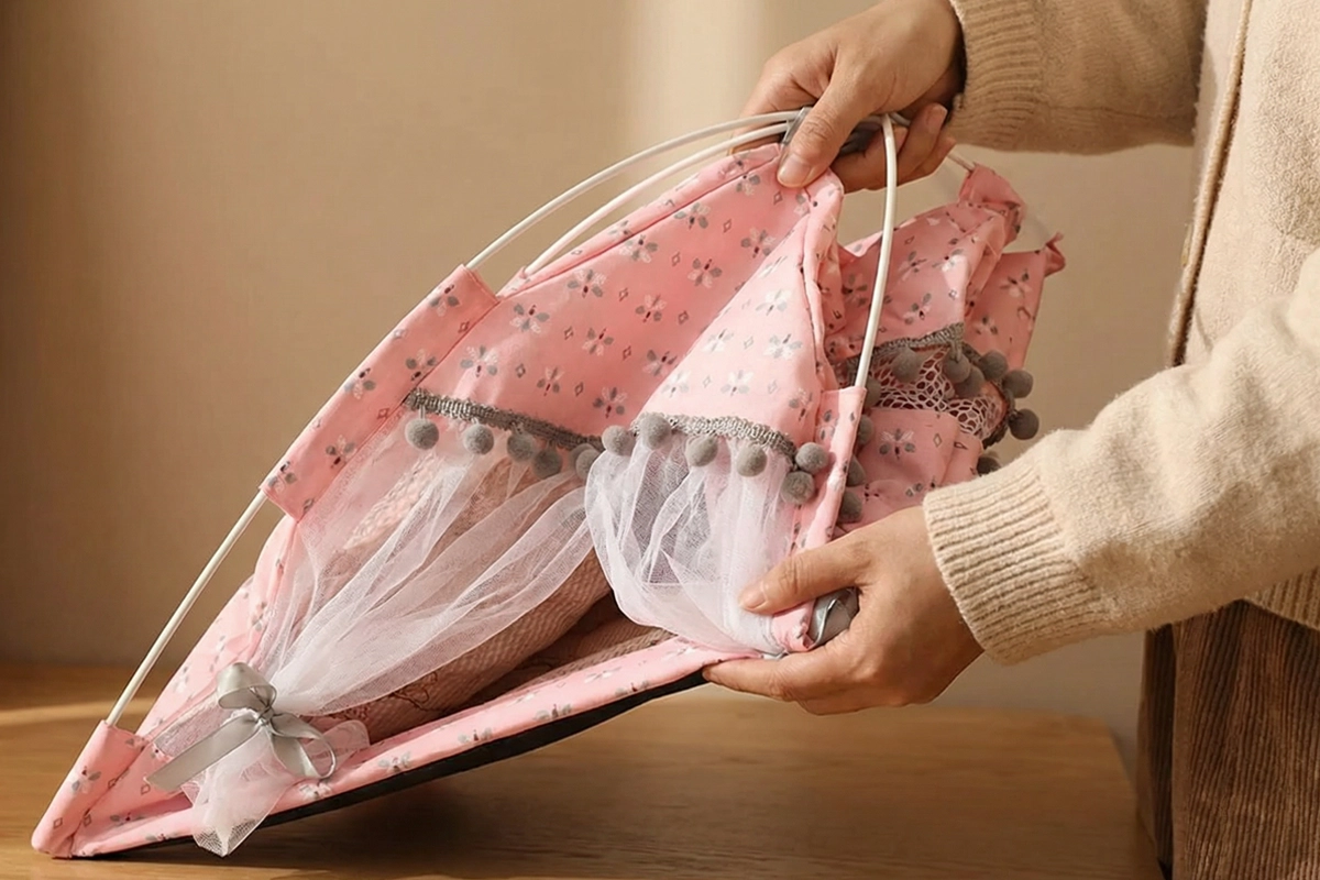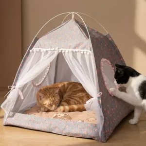 Căsuță drăguță pentru pisici – Igloo respirabil pentru animale cu draperii