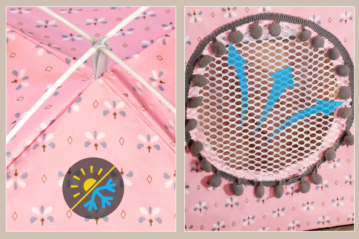 Materialul respirabil menține animalele răcoroase în zilele calde. Pereții izolați oferă căldură atunci când aerul devine răcoros.