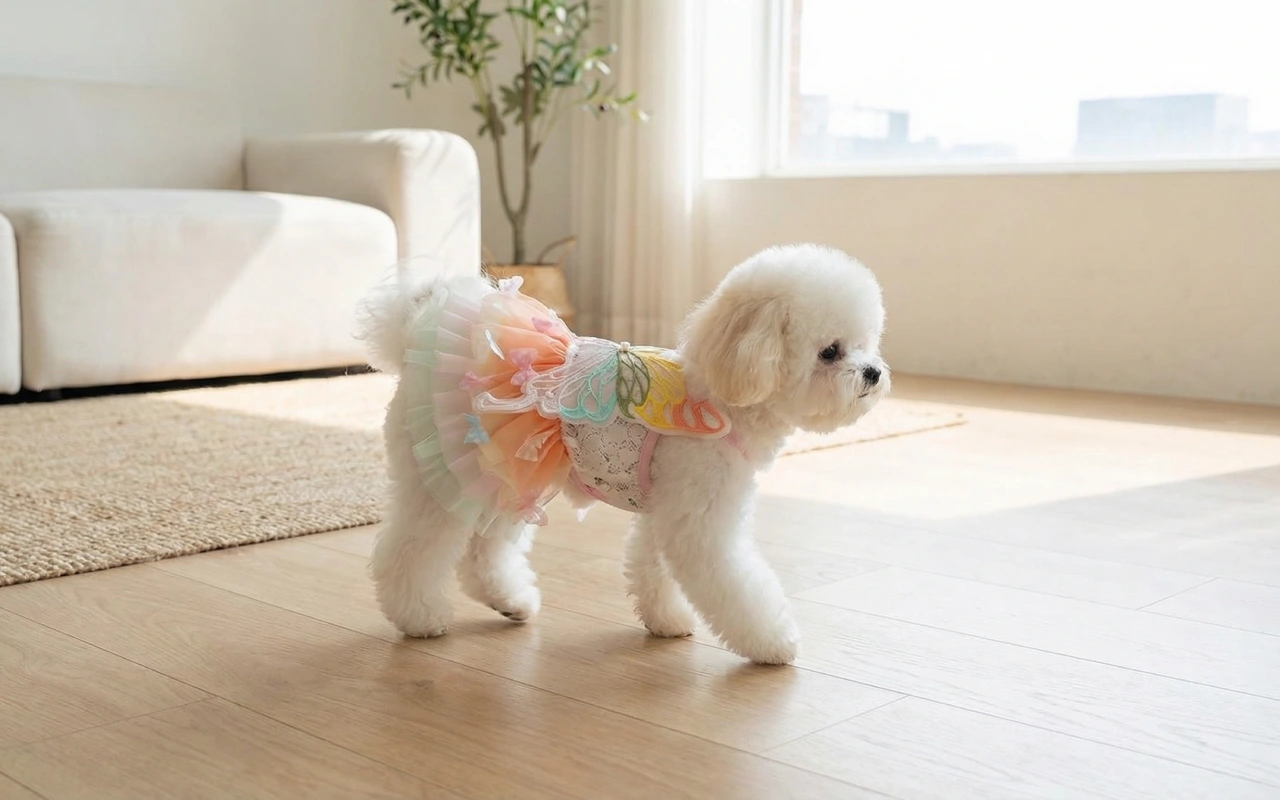 Câinelui meu de obicei nu-i plac hainele, dar pe aceasta nu o deranjează deloc. Se îmbracă rapid, iar fustița foșnește când merge.