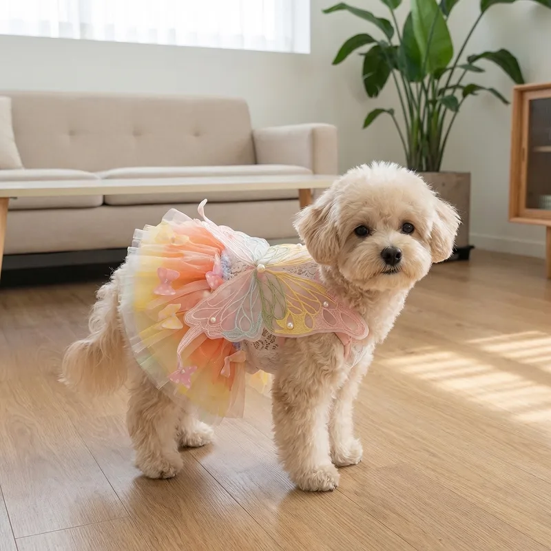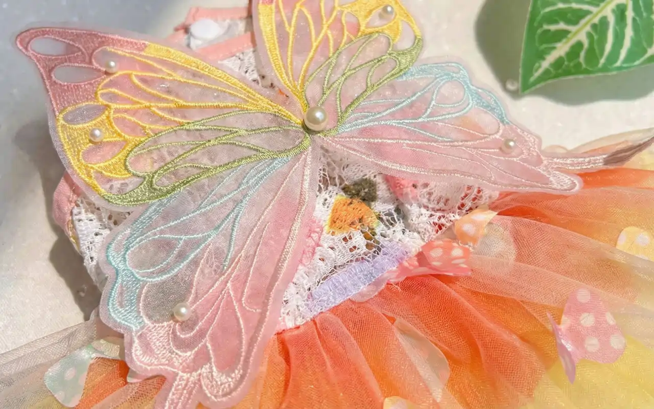 Transformă-ți animalul de companie într-o apariție de basm, pe loc. Dantela frumoasă și aripile de fluture adaugă un farmec irezistibil.