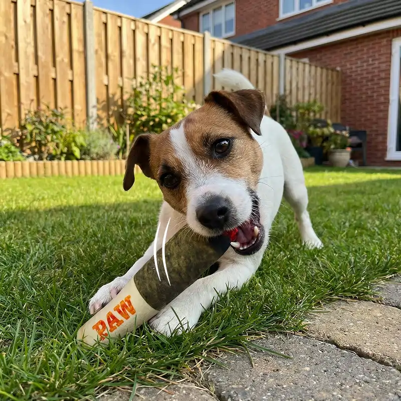 Am cumpărat jucăria tip țigară de pluș pentru câinele meu – roade destul de tare, dar rezistă bine. Îi place când scârțâie!