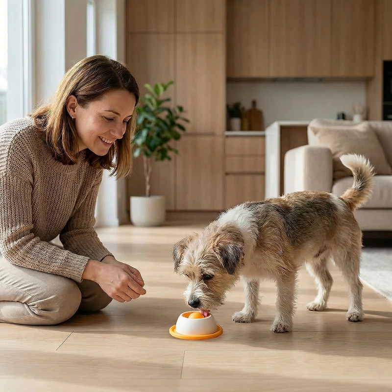 Animalele de companie se bucură de distracție interactivă în timp ce își mănâncă mesele. Linsul și joaca le îmbunătățesc dispoziția și reduc plictiseala.