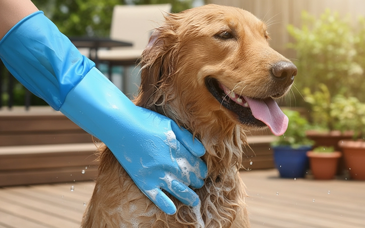 Timp de baie mult mai rapid acum! Aceste mănuși freacă murdăria fără să-mi supere câinele mare. Îmi place cât de ușor se curăță și ele.