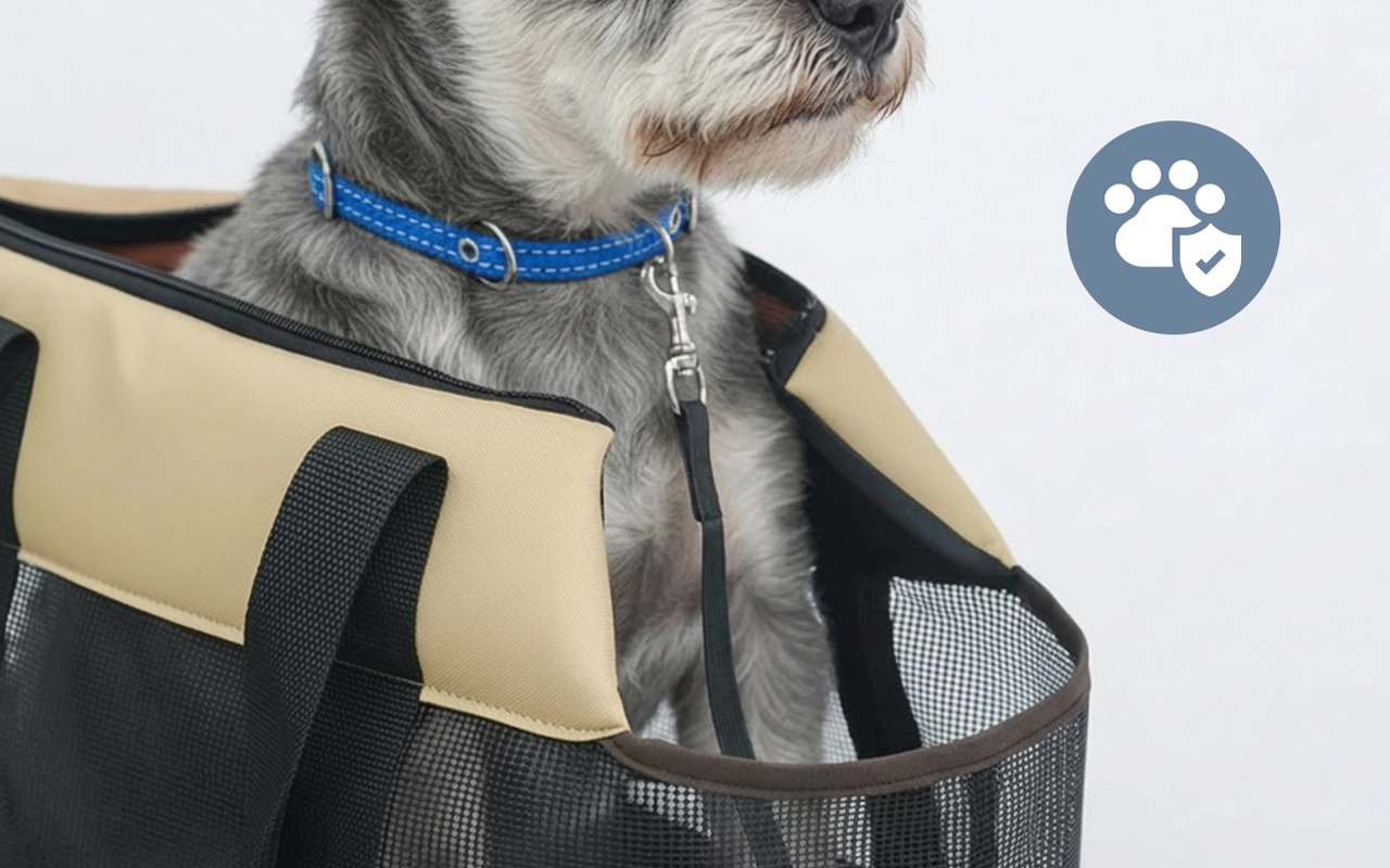 Geantă pentru transport câini din material textil respirabil cu plasă și lesă