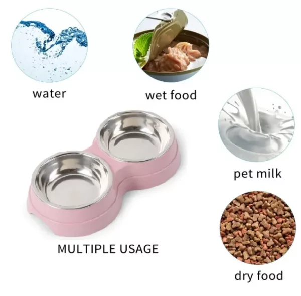 Bolul din oțel inoxidabil nu se sparge dacă este scăpat sau răsturnat, spre deosebire de bolurile ceramice și este rezistent la ros, spre deosebire de bolurile din plastic. De asemenea, sunt sigure pentru mașina de spălat vase și nu rețin mirosuri, făcându-le mai igienice decât alte opțiuni. Are o textură elegantă care se potrivește oricărui design interior al casei. Două boluri din oțel inoxidabil, rezistente și durabile, se potrivesc în suportul colorat din plastic. Sunt excelente atât pentru mâncare, cât și pentru apă, indiferent de temperatură.