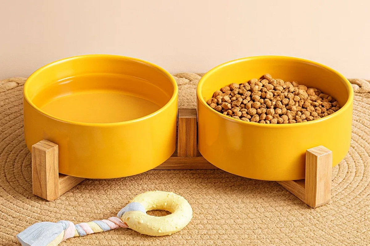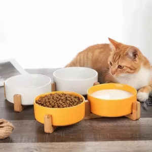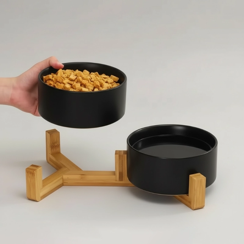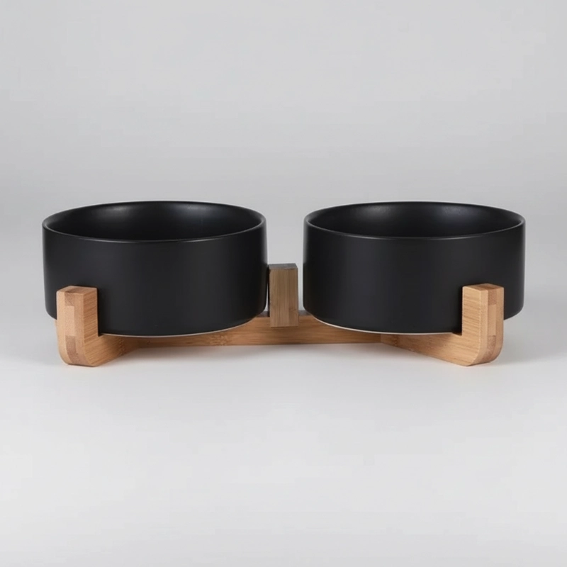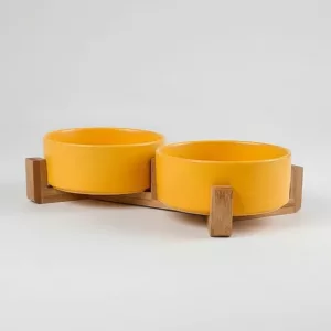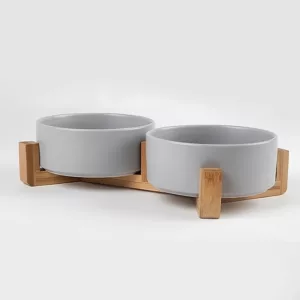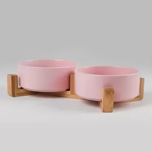Bol ceramic două-în-unu pentru animale cu suport din lemn