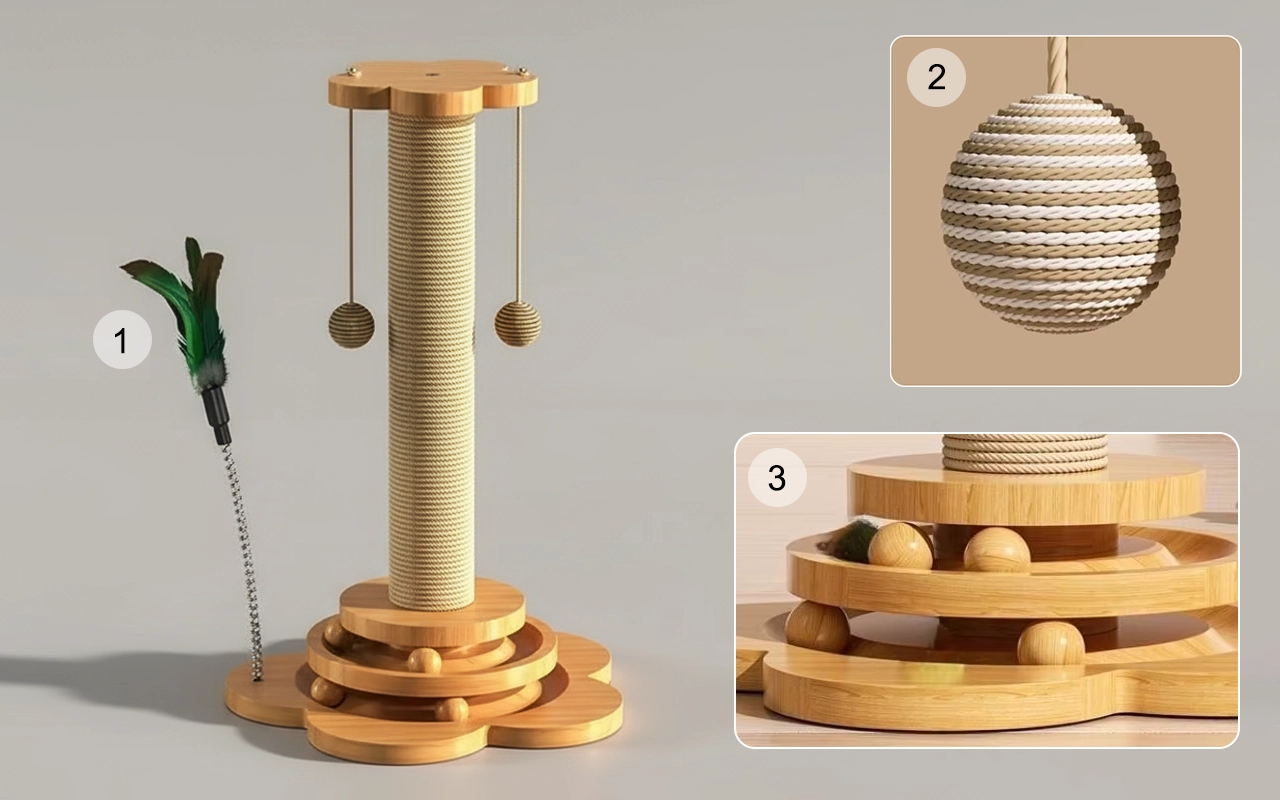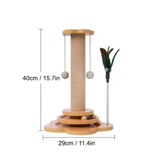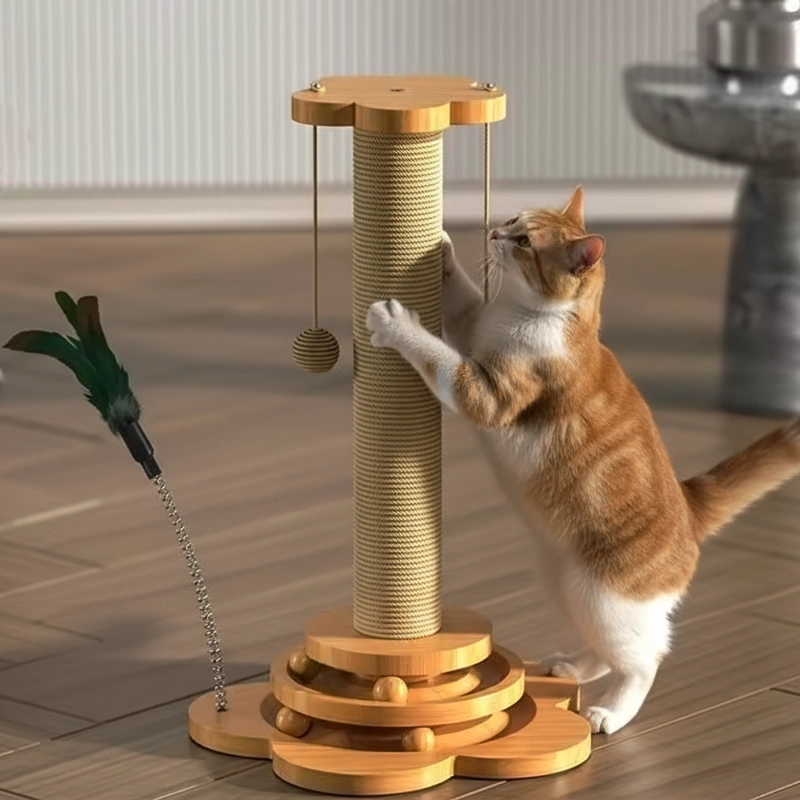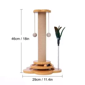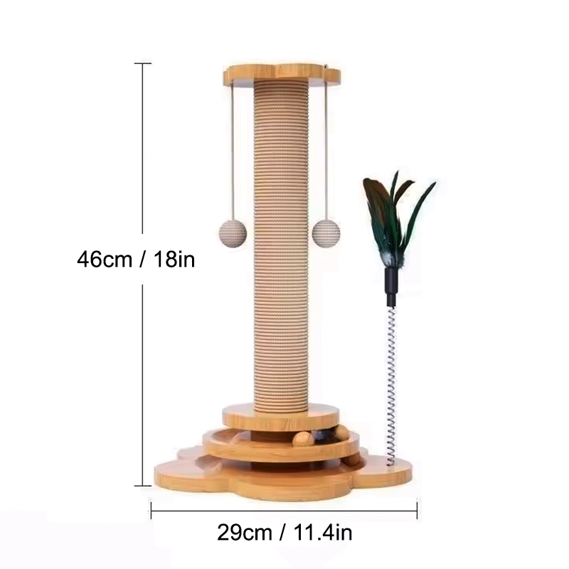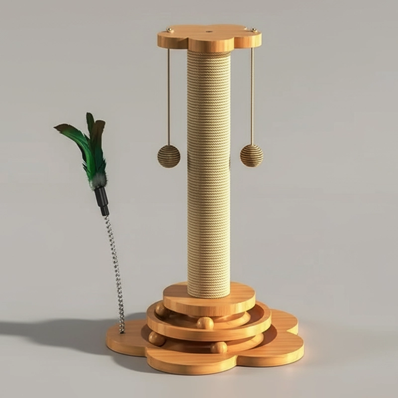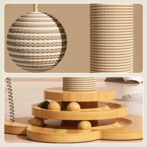 Stâlp din lemn cu sisal pentru pisici, cu mingi suspendate